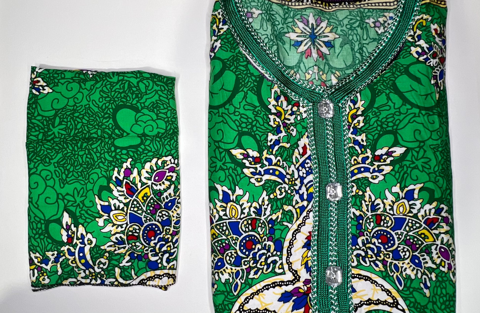 As our kaftans are cut by hand, shape/print placement may vary.